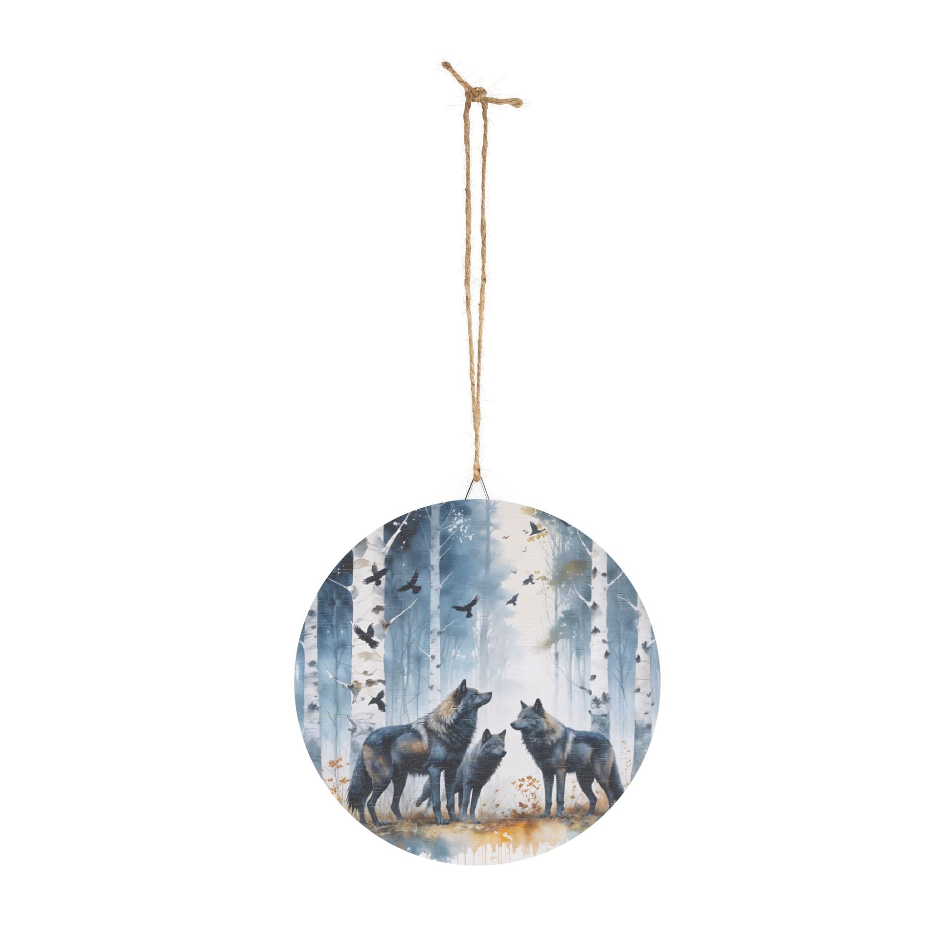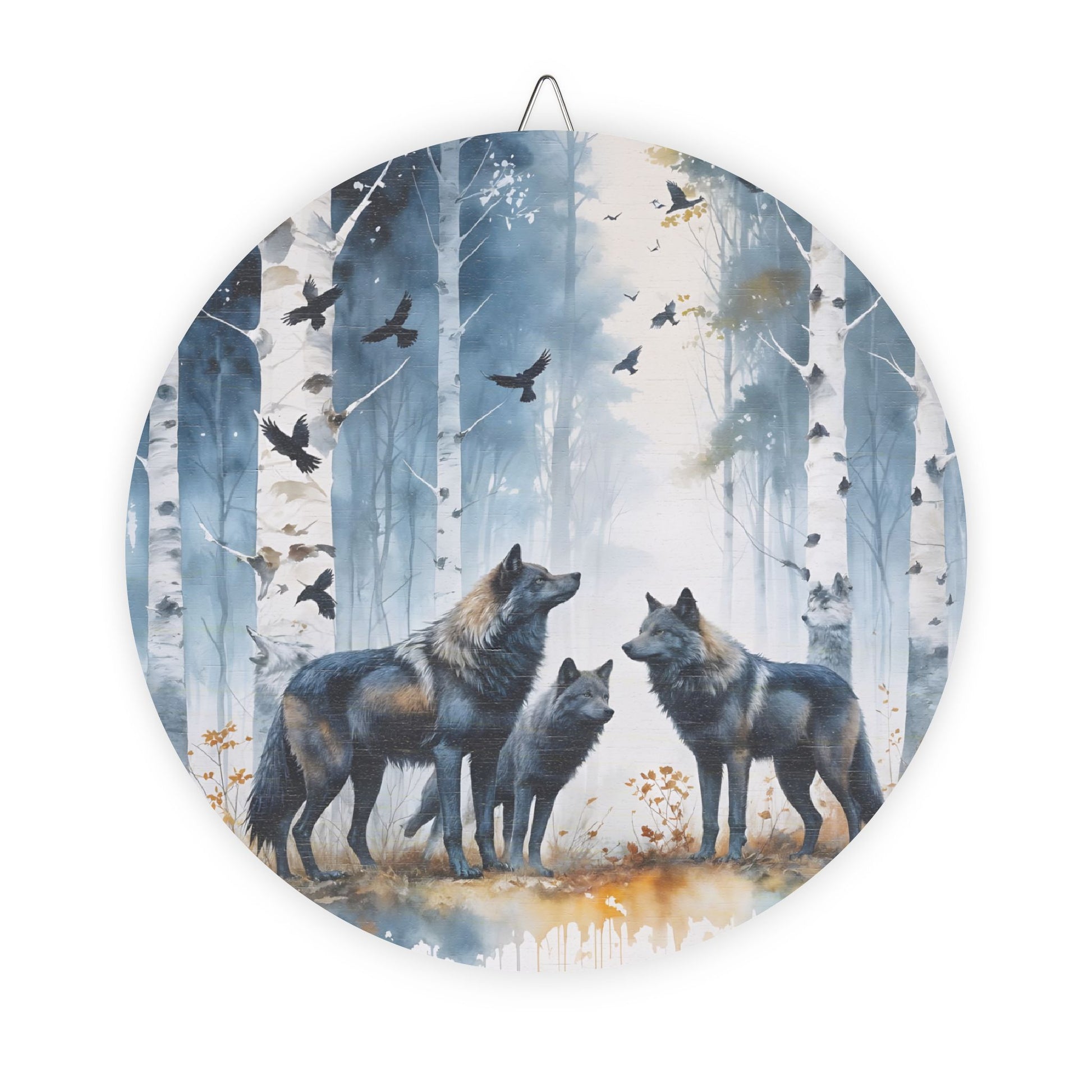 A family of wolves meets within the misty birch trees in the wintery forrest while crows soar overhead.