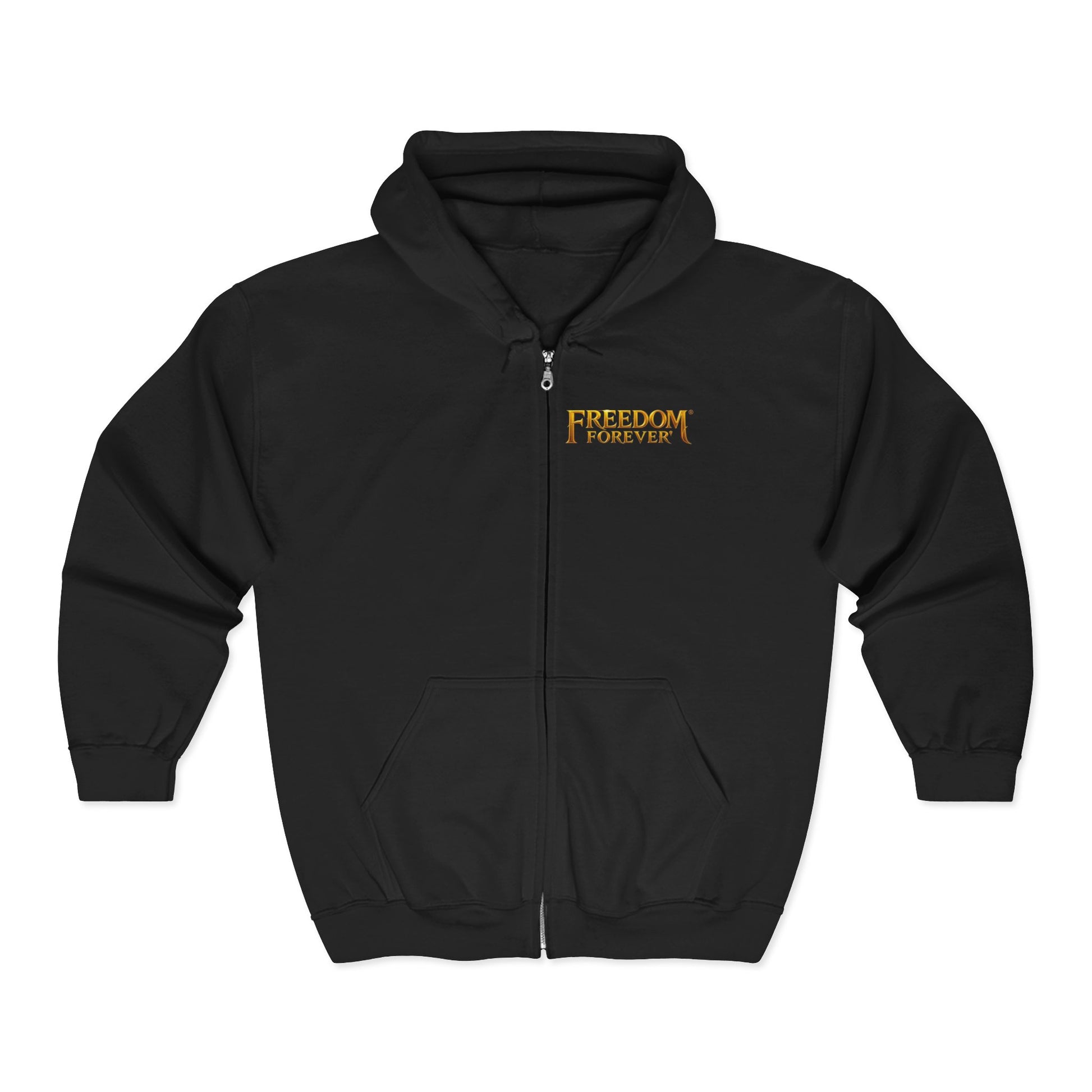 This patriotic hoodie features a bold design of President Trump holding his fist high, riding a motorcycle in front of the American flag with the lettering FIGHT FOR FREEDOM. The front features a small FREEDOM FOREVER logo printed in gold. Perfect for those who want to show their support for the President and their love for America. Ideal for Fourth of July celebrations and political rallies.