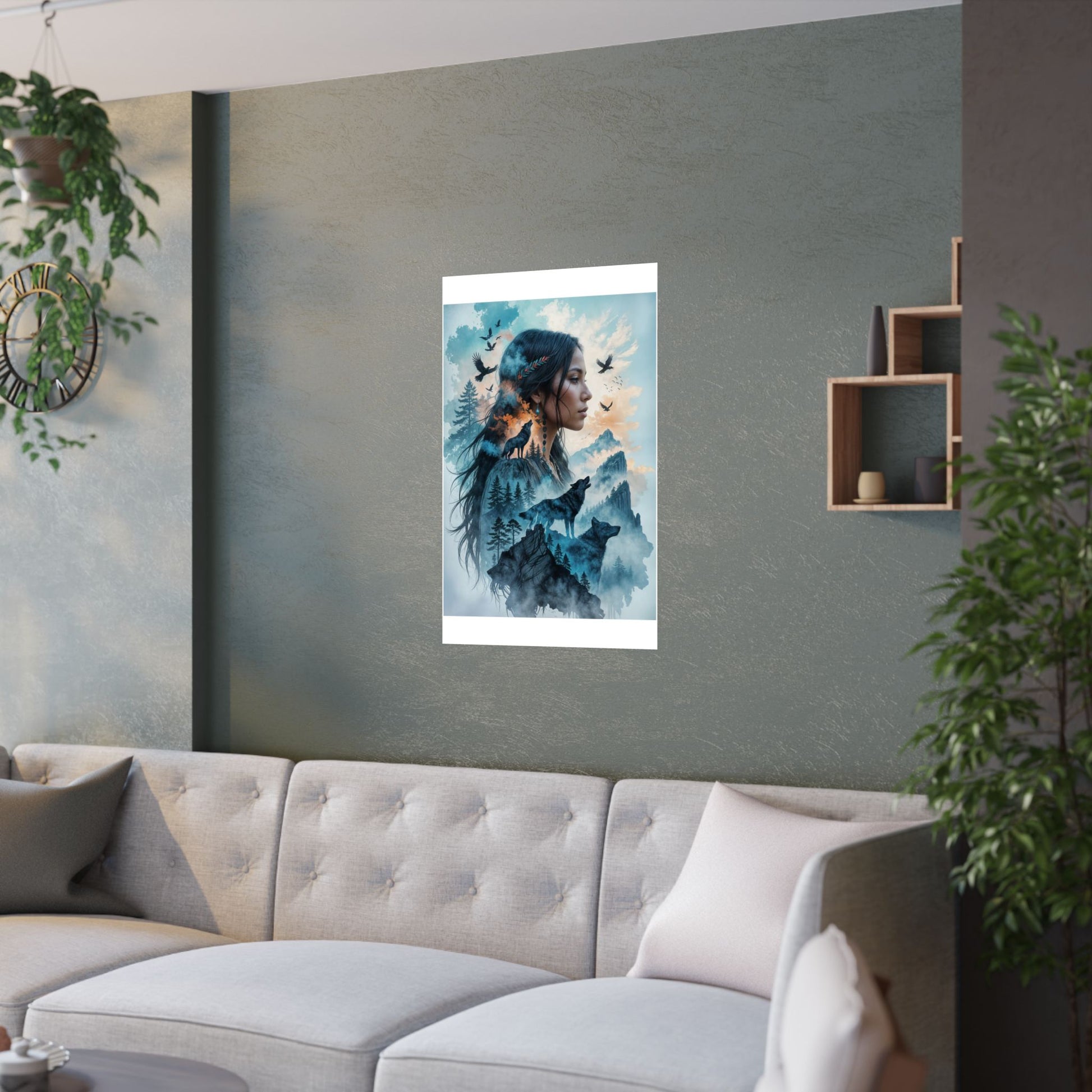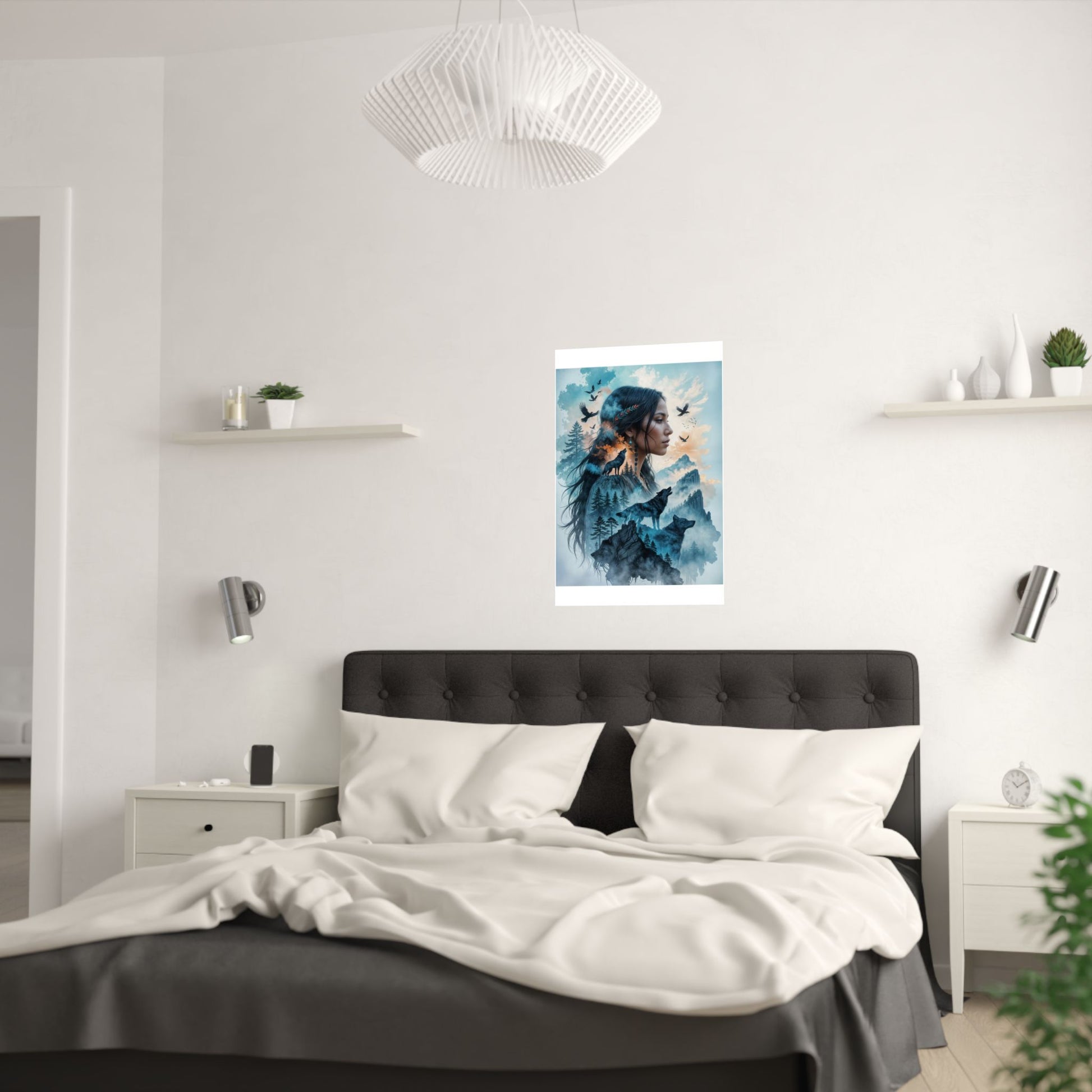 This archival satin poster captures a quiet, wild moment — a layered portrait where a contemplative woman blends into misty pines and howling wolves. The low-glare satin finish keeps colors rich without distracting shine, and museum-grade paper preserves the deep blues, warm sunset oranges, and crisp detail for years. Hung above a reading nook, studio desk, or entryway, the artwork invites a calm, story-filled pause: it feels like a memory of evening light and distant mountains, an image that settles the room and stirs the imagination.